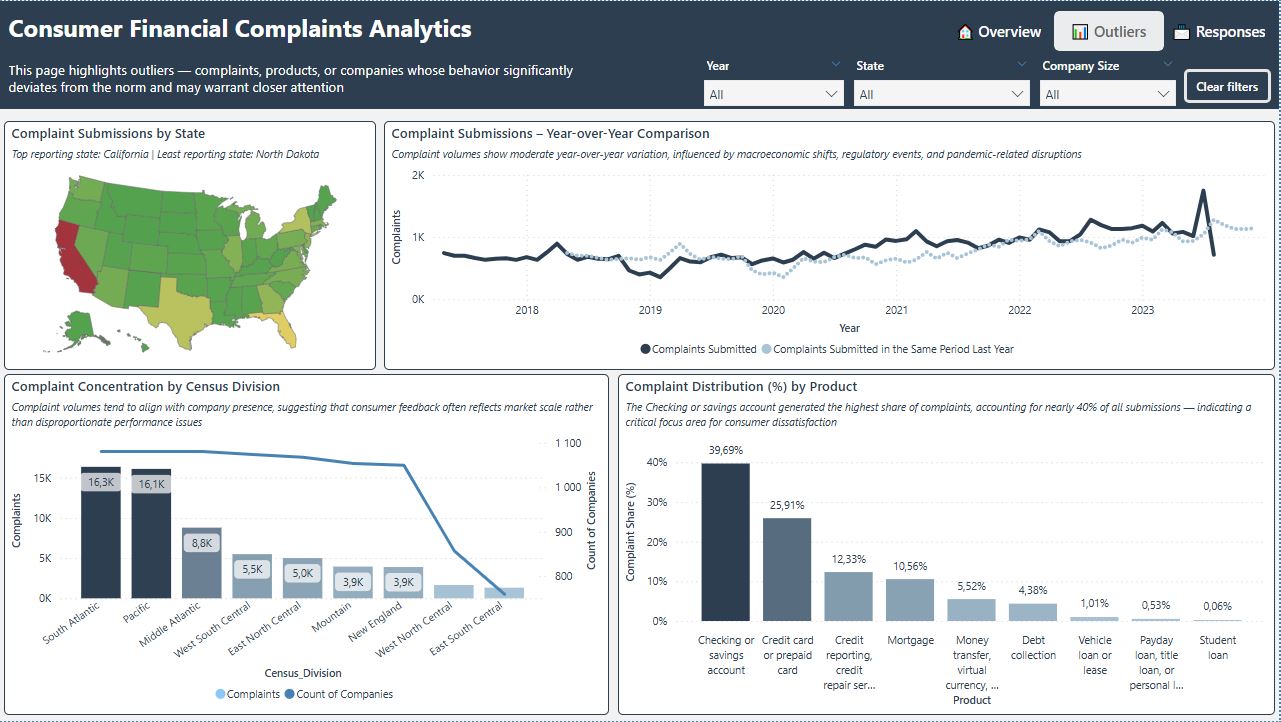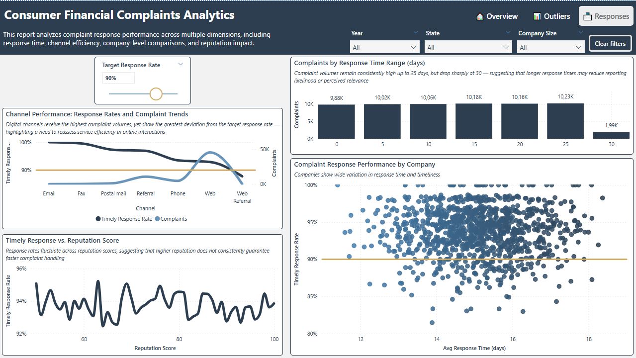 I focused on: • Surfacing outliers across geography, product, and company behavior • Comparing channels by complaint volume and timely response rate • Linking resolution speed to reputation — and exposing where perception and performance diverge