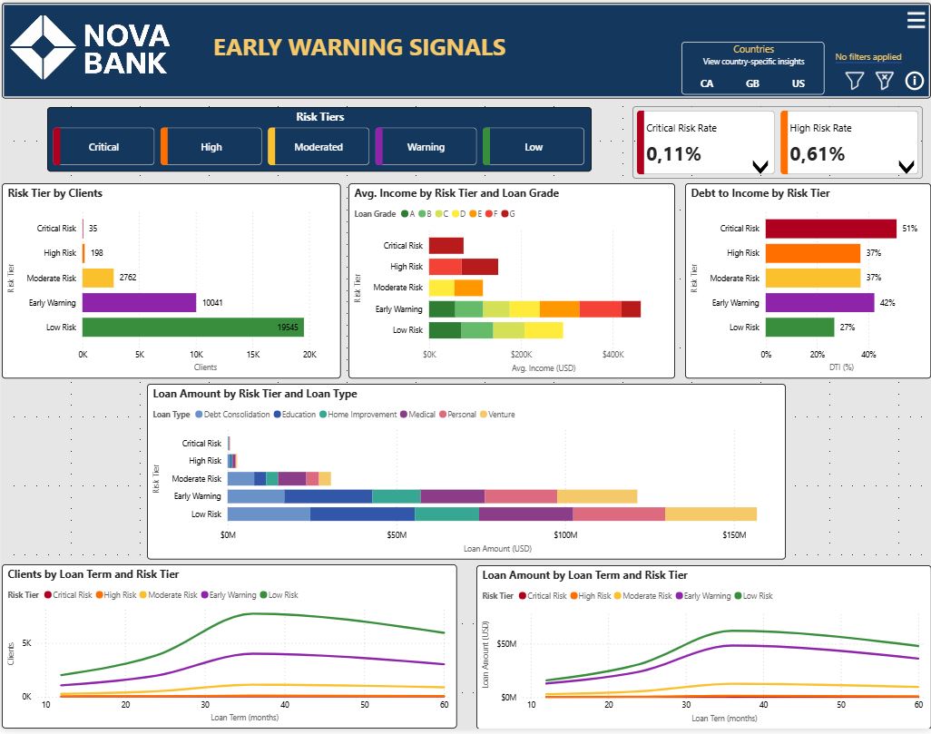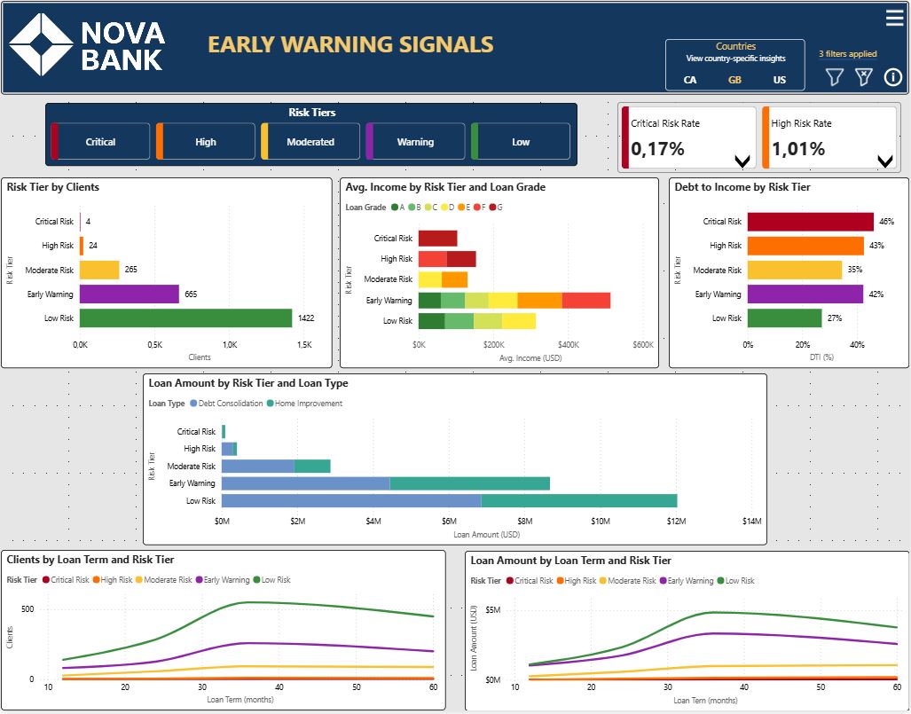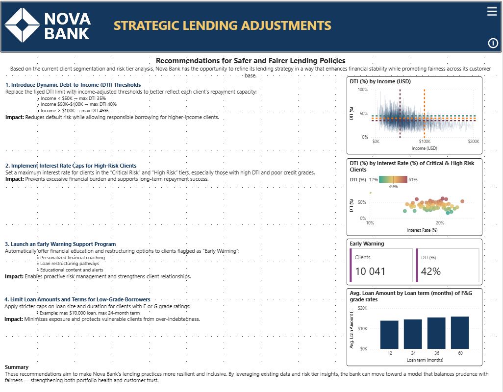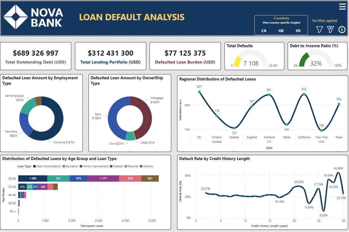 The Credit Risk Analysis BI report provides a comprehensive view of Nova Bank’s loan portfolio risk. Through interactive visuals, it highlights: • The distribution of defaulted loans by demographics and loan types • Key risk drivers such as income, interest rate, DTI and loan grade • Early warning signals that may precede financial distress • Strategic recommendations for safer and fairer lending practices The report is designed to support decision-making, reduce exposure, and enhance client management.