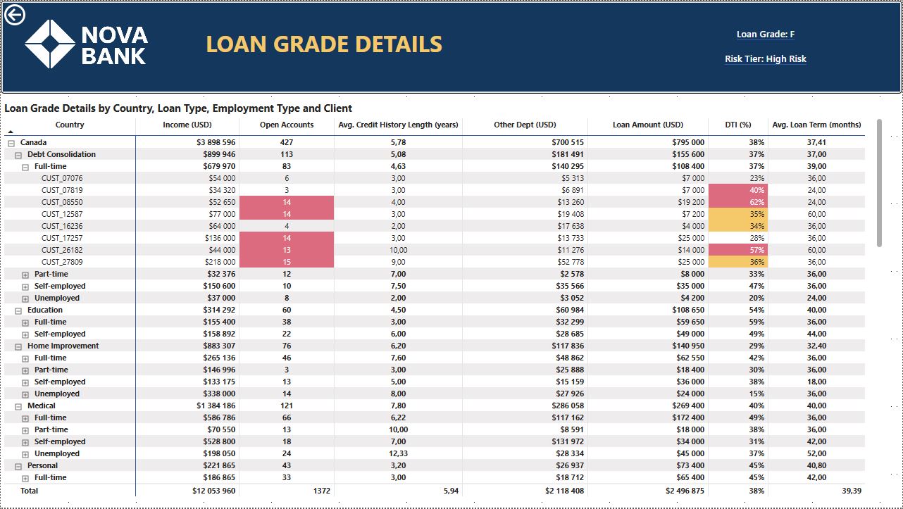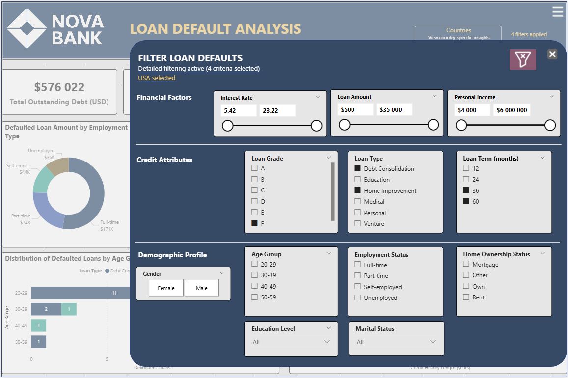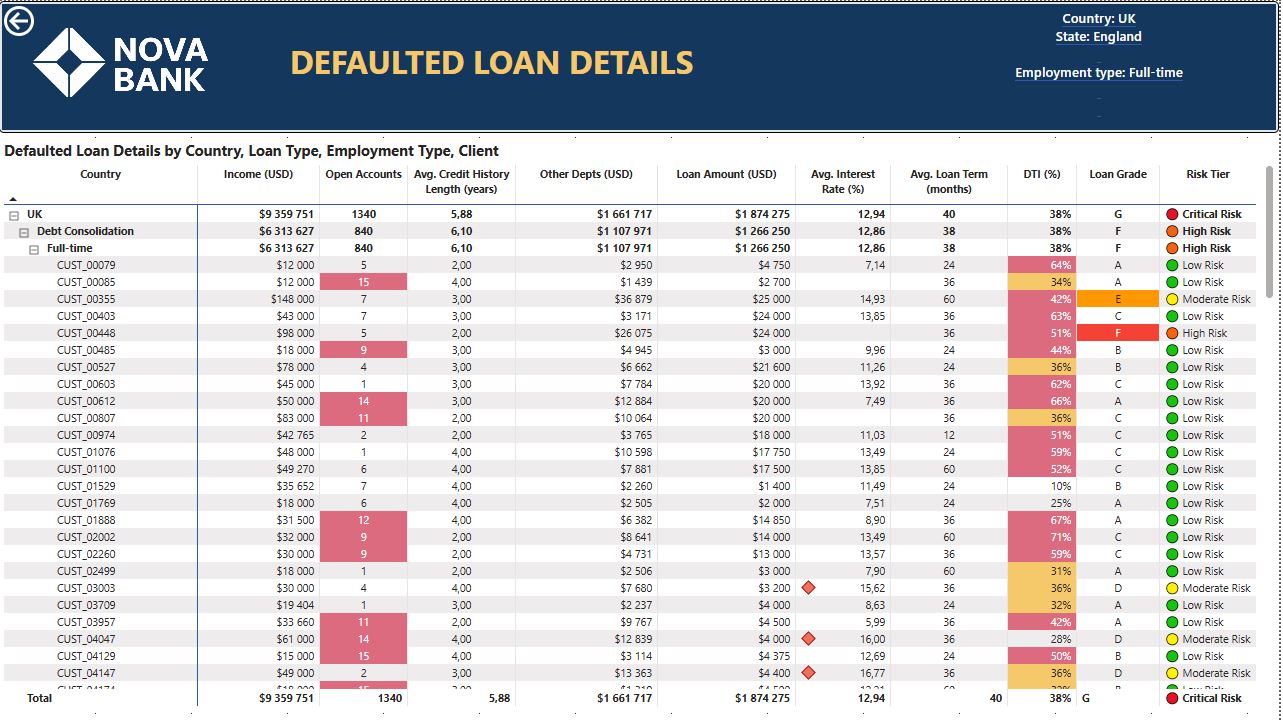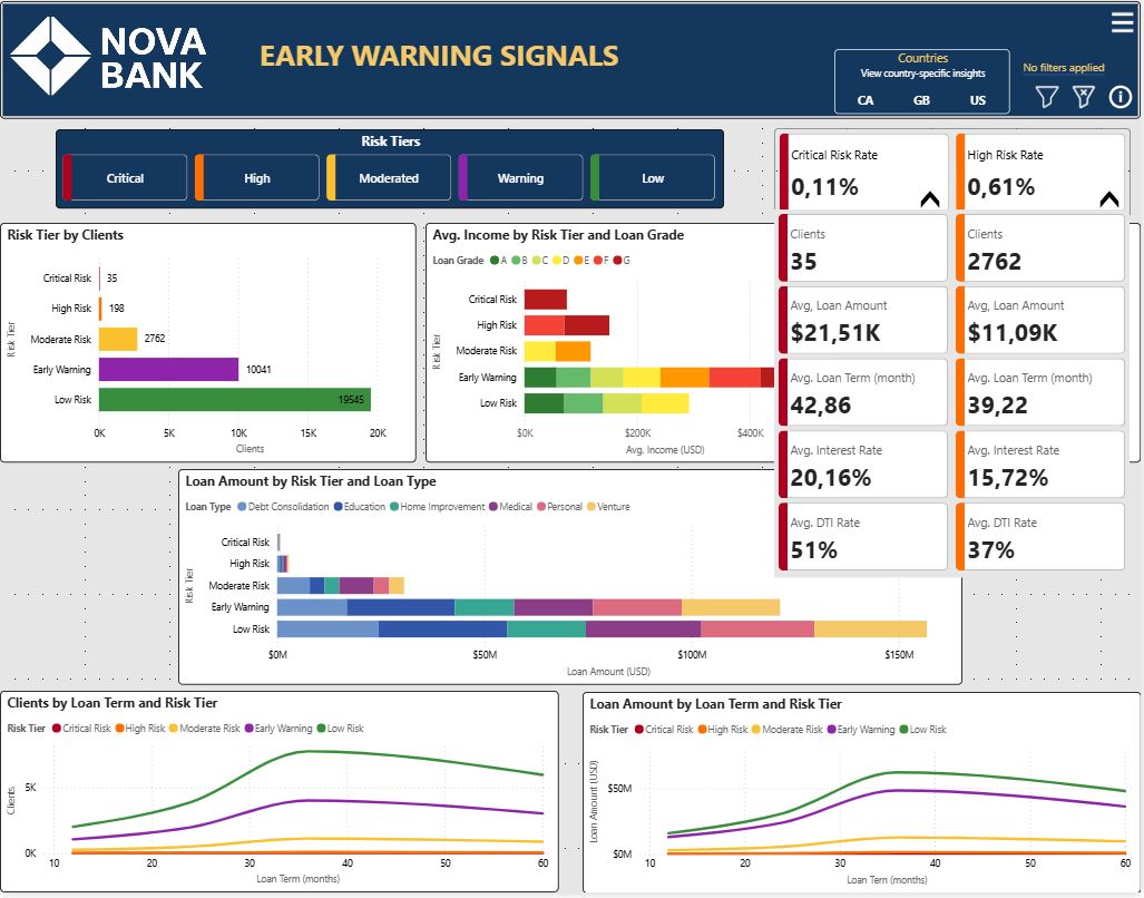 The Credit Risk Analysis BI report provides a comprehensive view of Nova Bank’s loan portfolio risk. Through interactive visuals, it highlights: • The distribution of defaulted loans by demographics and loan types • Key risk drivers such as income, interest rate, DTI and loan grade • Early warning signals that may precede financial distress • Strategic recommendations for safer and fairer lending practices The report is designed to support decision-making, reduce exposure, and enhance client management.