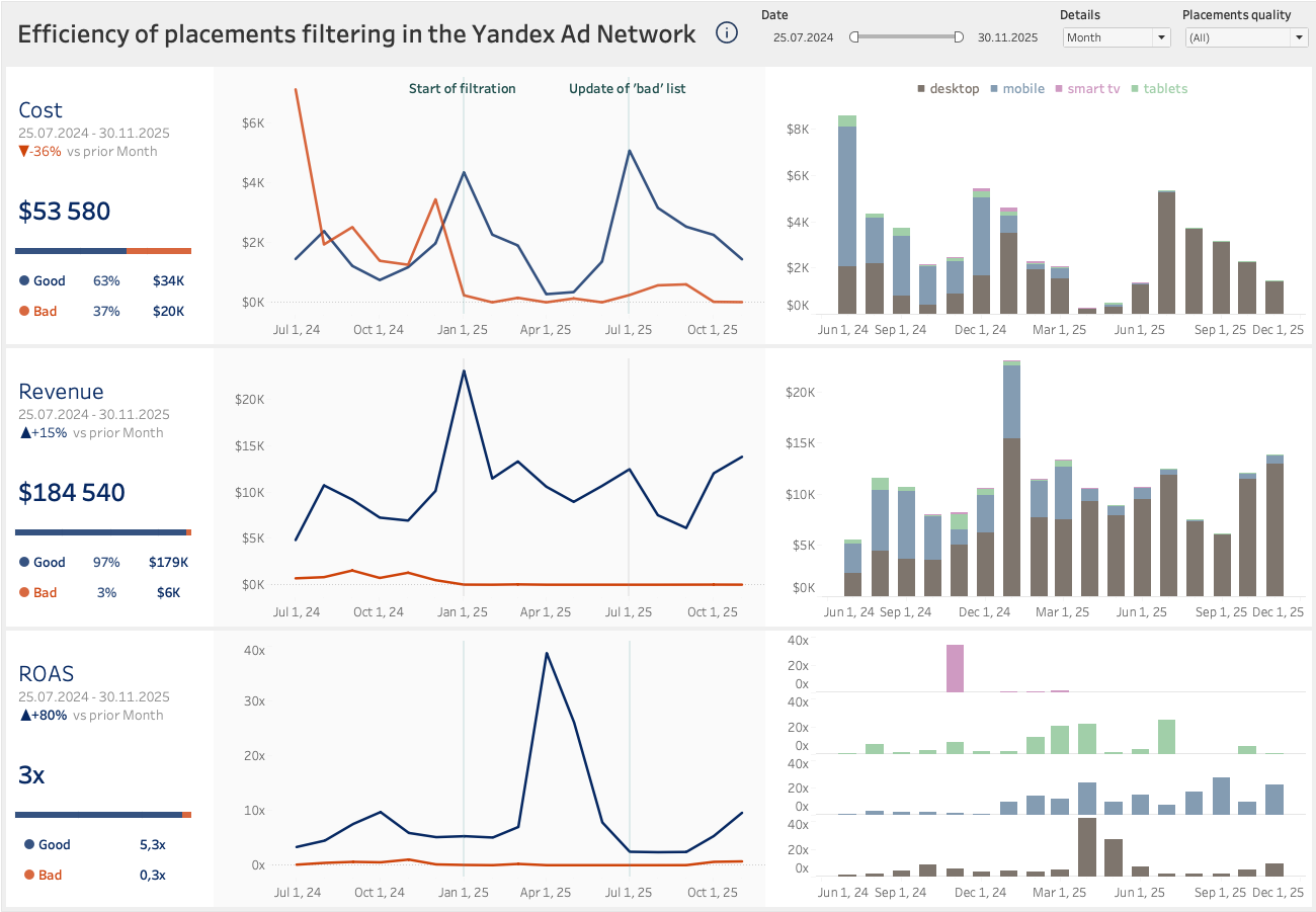 Dashboard created for monitoring as part of a case “Increasing ROAS from advertising in Yandex Advertising Network”. Actual costs and revenue figures have been altered for confidentiality.