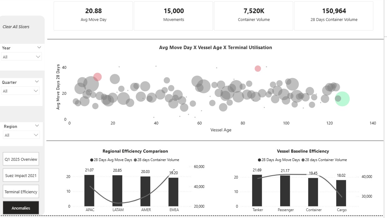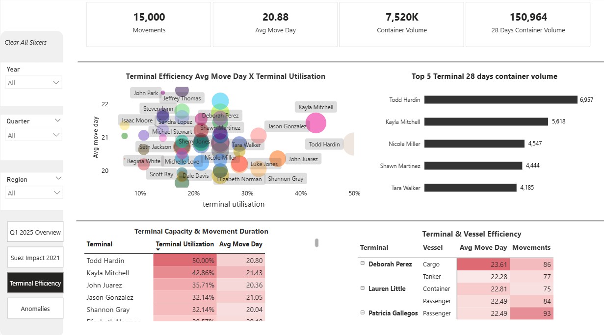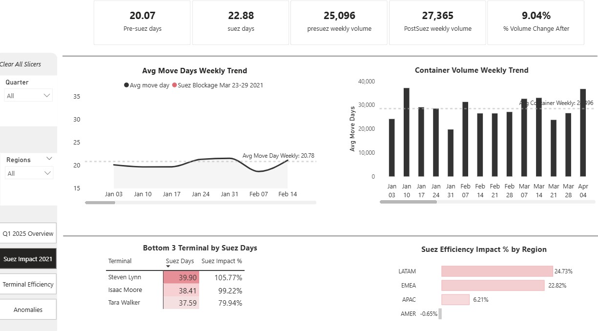 Page 1 Q1 2025 overview: It shows overall view of operations across years from 2021-2024 based on selected slicer period Year, Quarter and Regions. Each Visual in this page update based on slicer selection to provide operational context. KPI Avg move day and 28 days container volume gives context to other visuals, and Target 15% reduction is goal for q1 2025. Line chart and Column graph shows rolling 28 avg move day and rolling 28 container volume months to month comparison. Terminal Impact Bar Chart shows for selected period 2024 Todd Hardin shows busy terminal it utilized 50% of its capacity and avg move days 20.63 followed by Kayla Mitchell avg move day 22.05 and terminal utilization is 42.86.High Impact terminals are calculated based on Avg move days and Terminal utilization terminal utilization=divide (total containers 28 days, terminal capacity 28 days) If high Utilization high avg move days that terminal is under capacity strain and Terminal capacity is based on max daily volume X 28 days. Page 2 Suez Impact Analysis 2021: This page only shows year 2021 Suez disruption and its impact on following months. Pre Suez Jan 1-Mar 22, Suez Blockage Mar 23- Mar 29 Post-Suez Mar 30-June 30 LATAM-the most affected Suez Blockage post SUEZ volume dropped to 3%-SUEZ days 25.91 EMEA- 2nd most affected region post-SUEZ volume up 12.63%- SUEZ days 23.55 AMER- Remains stable on SUEZ blockage, post SUEZ volume up to 20.54%. APAC- has mild impact on Suez days however its terminal Shawn Martinez high impact on Suez days almost 39.83. Line chart shows it took overall 90 days to normalized avg move days compare, week of June 13th shows 23.12 avg move days, week of June 27 shows avg move day18.68 Page 3 Terminal Efficiency: This page shows overview of terminal performance and vessel category efficiency. KPI shows overall movements, avg move days overall container volume and 28 days container volume. All visuals are dynamic update with the slicer and filter. For selected period 2021 Terminal Angel Castillo avg utilization 17.86% avg move day 23.09 low utilization high avg move days are operational inefficiencies. Terminal Scott Ray utilization 17.86 avg move day 18.55 highly efficient terminal. Bar Graph shows top 5 terminal by 28 days container volume. Vessel category container and cargo have higher move day for selected period 2024. Selected year 2023 Terminal Matthew Ramirez terminal utilization 10.71% avg move days 23.71 higher than avg move day for year 2023. This is operational inefficiency. Page 4 Anomalies: This page shows vessels pattern. The bubble chart compares rolling 28 avg move days, vessel age, size container volume. It is interesting to know that selected year 2024 vessel age 126 has avg move days 15.71 28 days container volume 3700.Vessel age does not affect the movement time. However Regional hub LATAM affects the vessel category operational efficiency. LATAM Tanker has 23.96 avg days for selected period 2024.