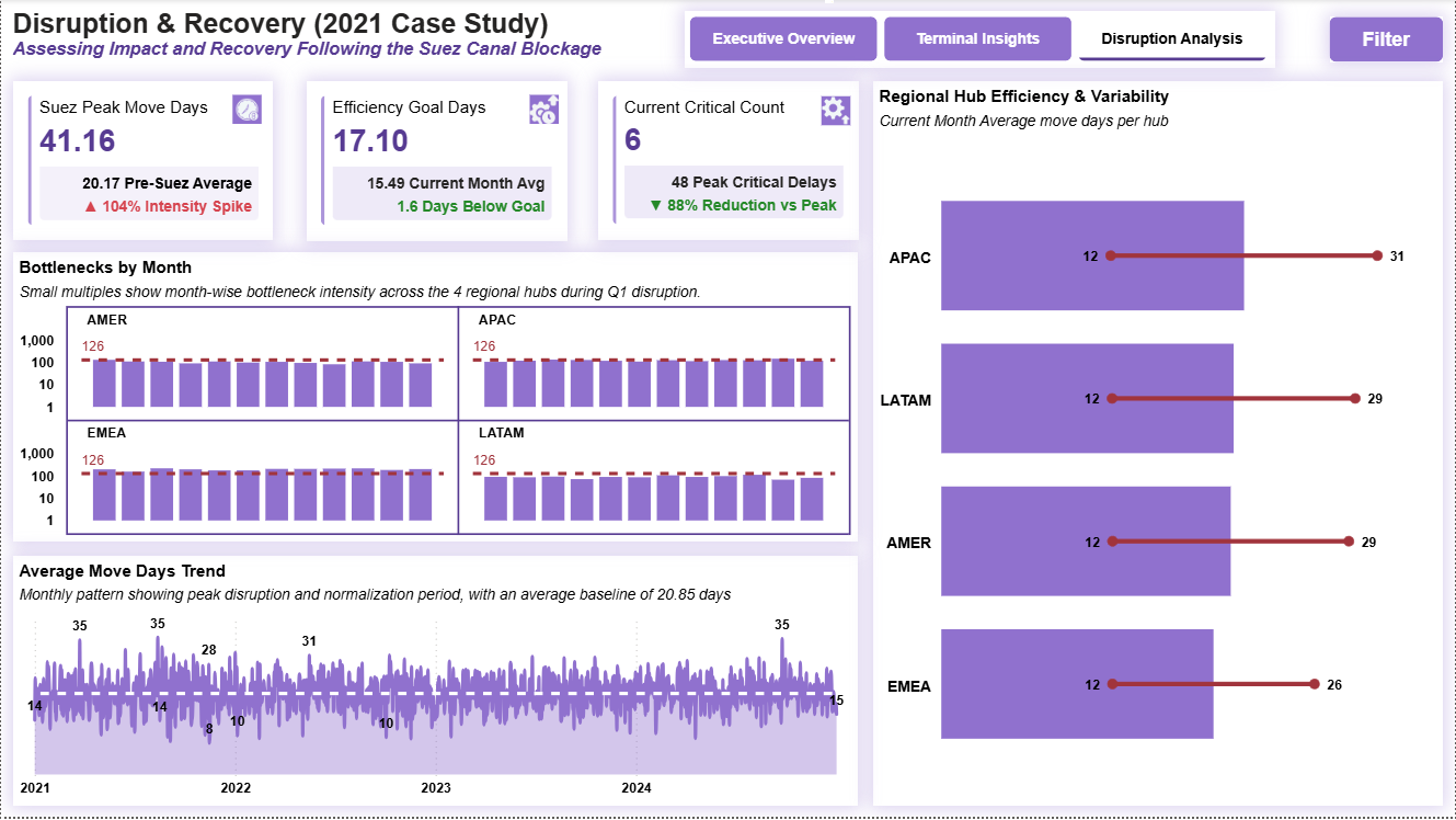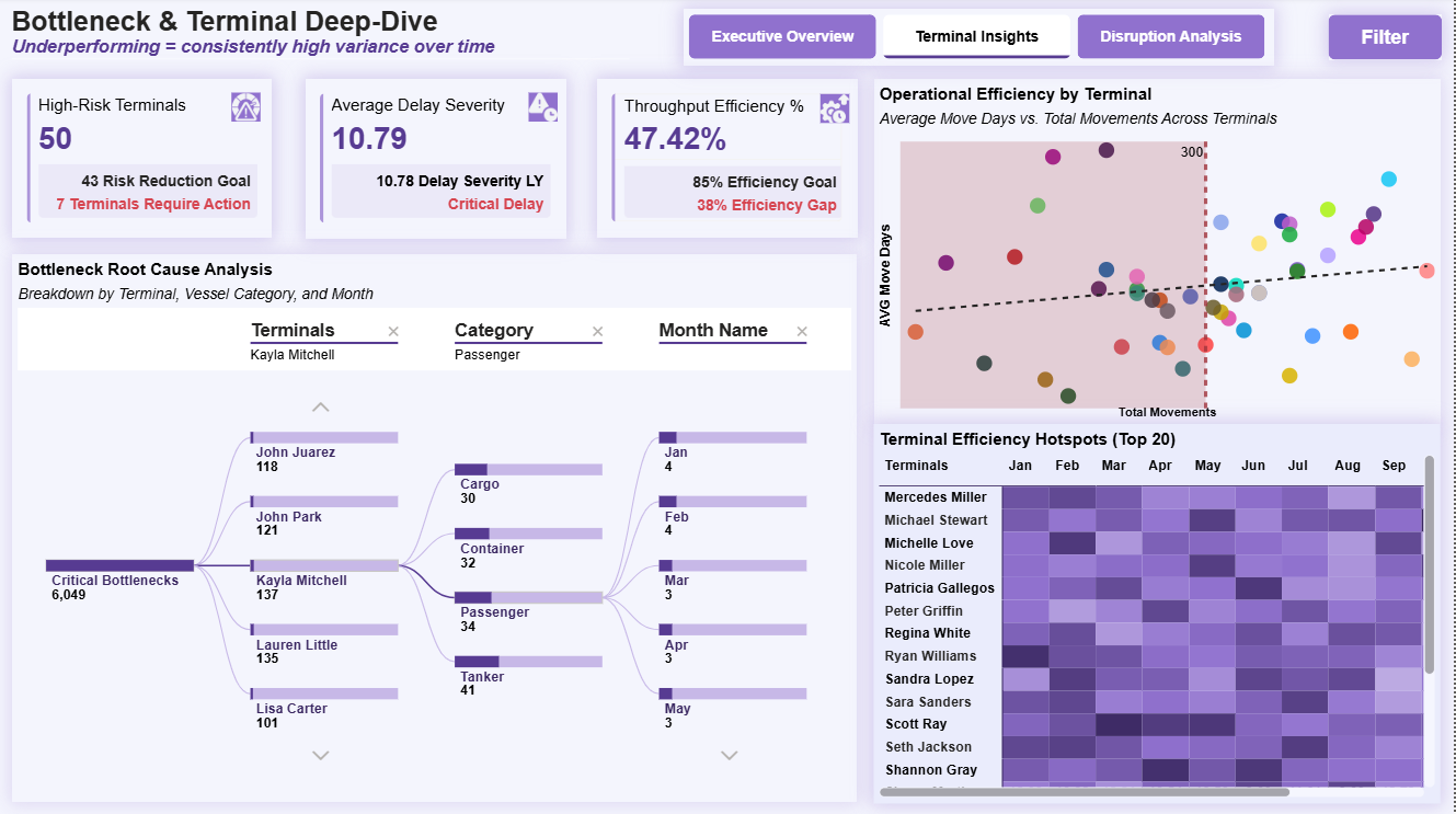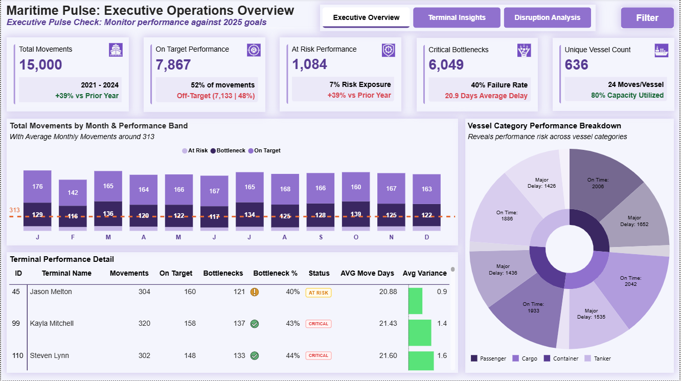 This repository contains a comprehensive three-page Power BI reporting suite designed for the Onyx Data DNA Dataset Challenge. The "Maritime Pulse" dashboard provides an executive-level view of global shipping operations, focusing on identifying bottlenecks, monitoring vessel efficiency, and analyzing historical disruption recovery.