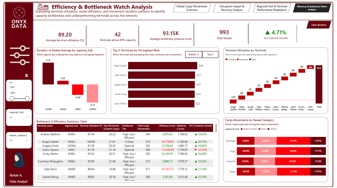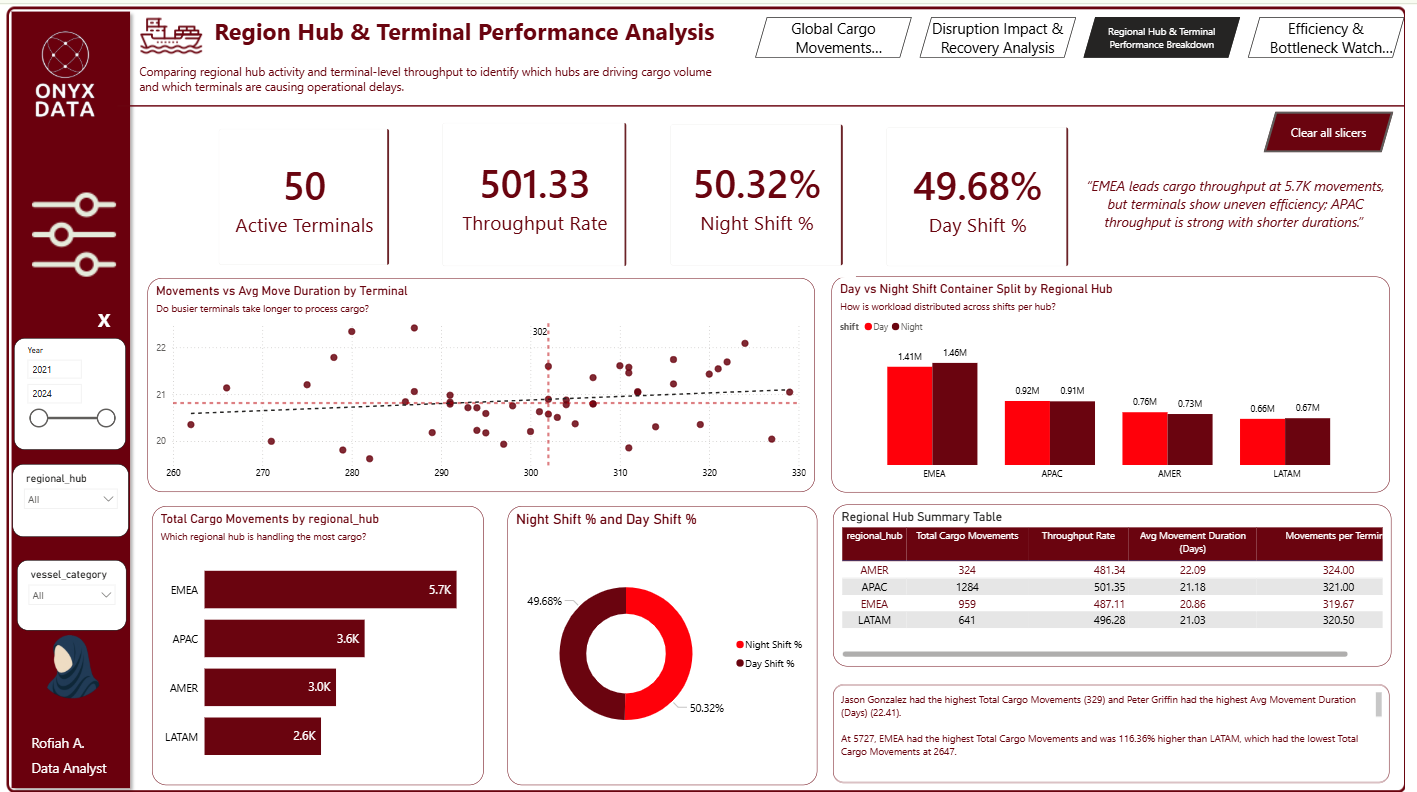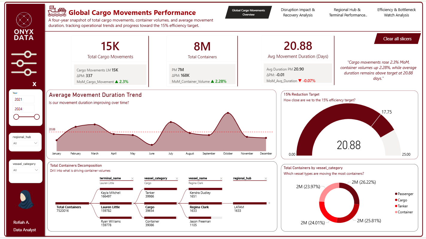 I participated in this month of April's Onyx Data Challenge, where I stepped into the role of a Senior Operations Analyst at the company to analyze global maritime terminal operations to uncover inefficiencies, bottlenecks, and disruption impacts. Using cargo movement data across hubs, terminals, and vessel categories, the dashboard helps leadership reduce average movement times by 15% and optimize terminal allocation.