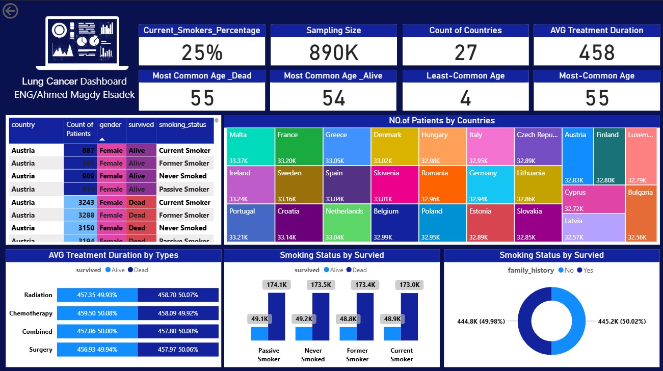 This Power BI dashboard visualizes key diagnostic indicators related to lung cancer, helping medical professionals identify patterns and correlations between symptoms, smoking status, age groups, and test results. The report is designed to support early detection and improve clinical decision-making by showcasing data trends across multiple dimensions. Key Visuals include: Patient distribution by diagnosis (Benign vs Malignant) Age vs Diagnosis patterns Smoking status impact Gender-based analysis Lung region correlation Built with Power BI using DAX and data modeling techniques to transform raw medical data into actionable insights