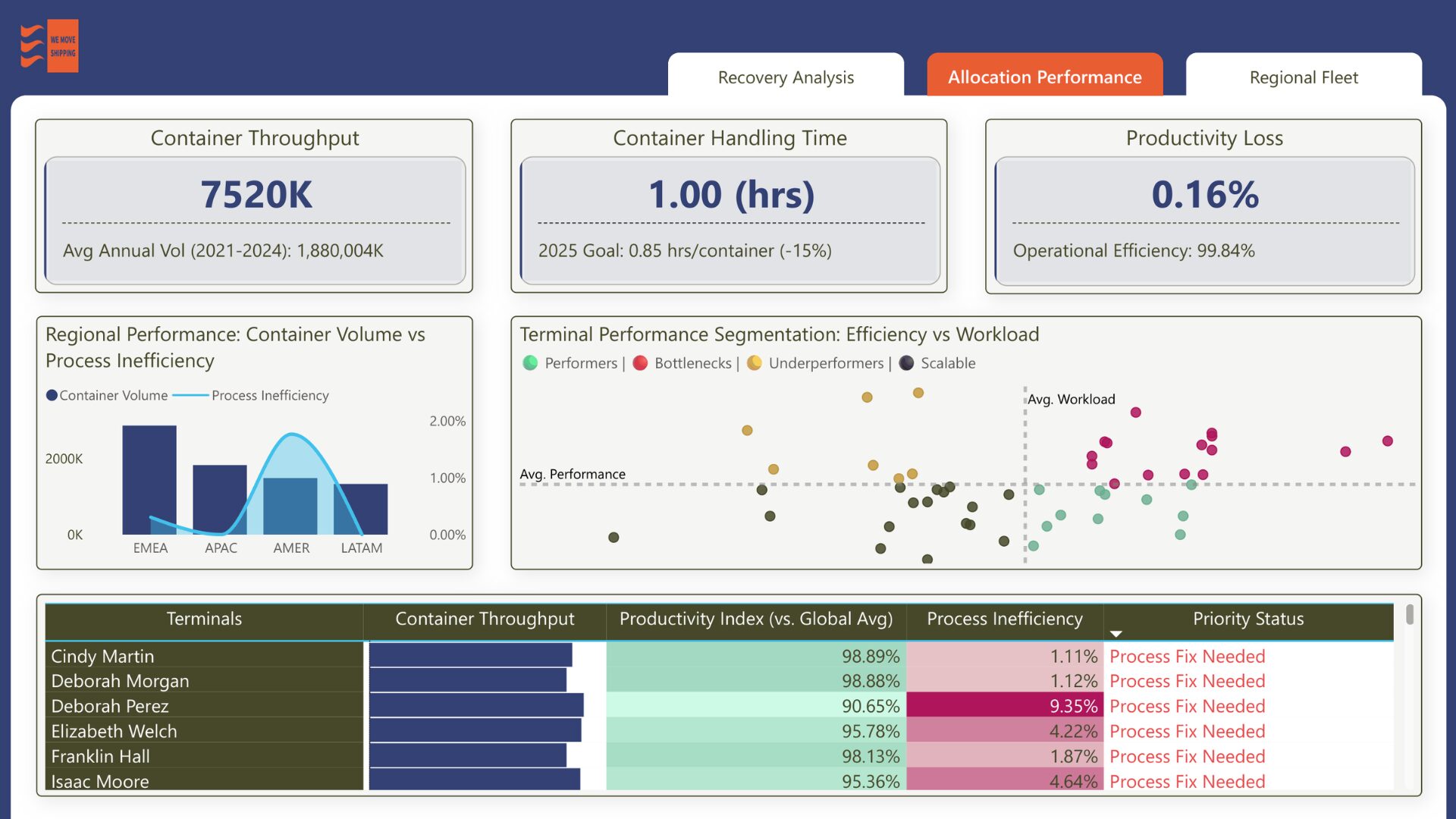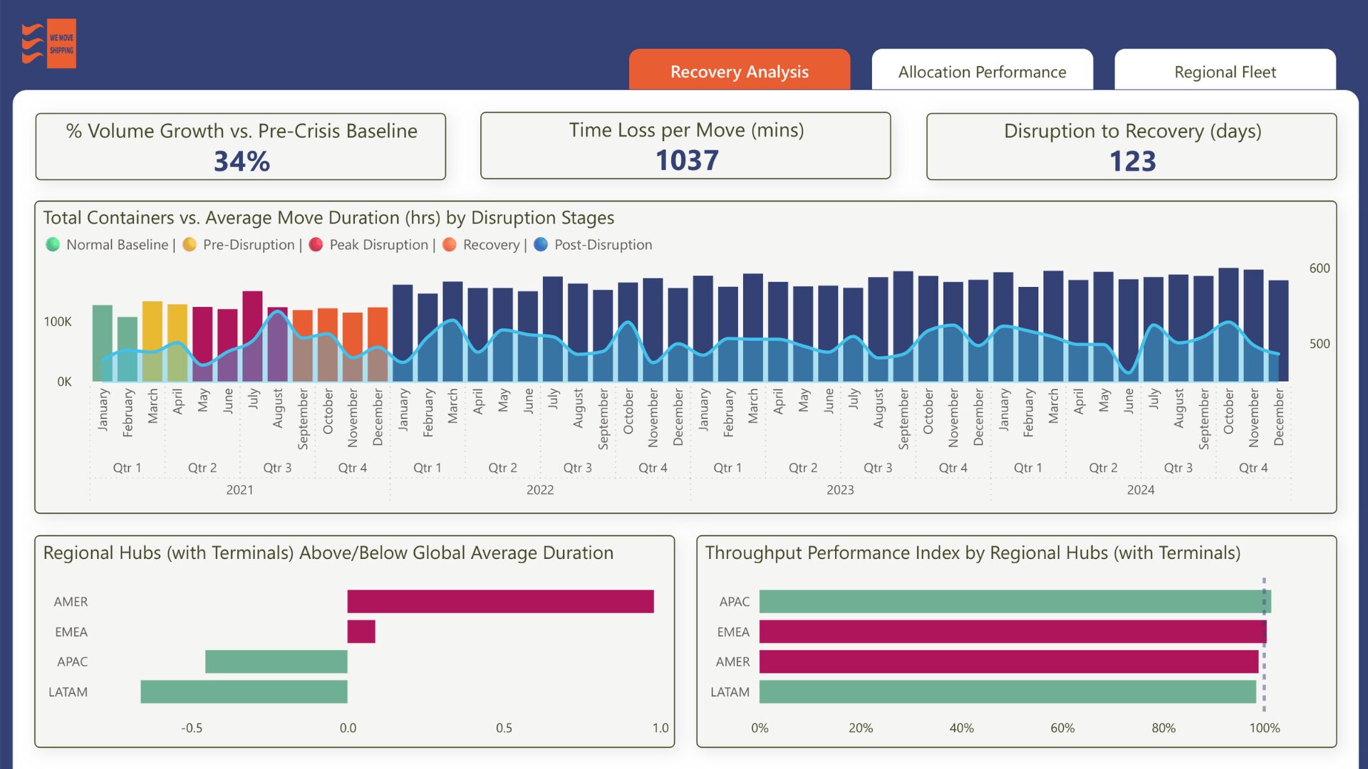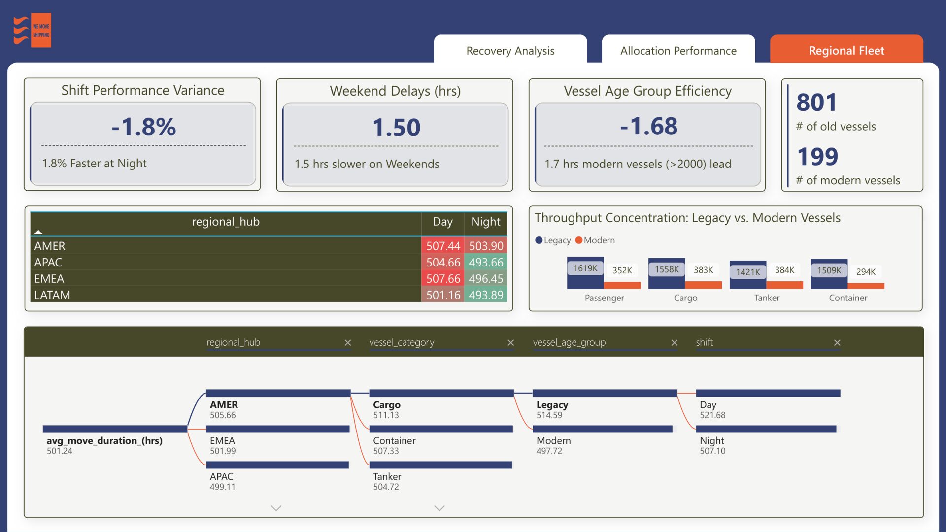 Findings: >>Recovery Analysis The Suez incident triggered a 123-day recovery window, characterized by a 34% surge in "vessel bunching" volume, which evolved into a permanent step-up in global throughput demand. This "new normal" imposes a 1,037-minute efficiency tax per move, exposing a regional disparity where high-volume hubs, such as EMEA, are red-lining due to infrastructure stress, while the AMER hub suffers from structural bottlenecks despite lower throughput. To mitigate the risk of total system seizure during future disruptions, the 2026 investment strategy must prioritize capacity expansion in EMEA to absorb high-intensity surges and a comprehensive process audit in AMER to resolve its inherent operational latency. >>Allocation Performance While the global network maintains a 99.84% operational efficiency with a handling time of 1.00 hours per container, the regional and terminal-level data reveal critical infrastructure imbalances that threaten our 2025 goal of 0.85 hrs/container. The Regional Performance analysis identifies a clear disparity: EMEA successfully processes the highest container volumes despite minor inefficiencies, whereas AMER exhibits the most significant process gaps relative to its workload. At the terminal level, our Performance Segmentation highlights a dense cluster of "Bottleneck" and "Underperformer" sites, specifically those in the upper-right quadrant of the scatterplot that are struggling under high workloads, contrasted against "Performers" and "Scalable" hubs that possess the latent capacity to absorb excess volume. With the Priority Status matrix currently flagging nearly all scrutinized terminals as either "Optimal" or requiring a "Process Fix," the immediate operational mandate is to prioritize infrastructure optimization and resource reallocation from high-pressure AMER bottlenecks and EMEA toward our scalable hubs to mitigate the identified 0.16% productivity loss and secure long-term network resilience. To see which terminals can benefit more through capacity expansion, you can access the file to explore my report. >>Regional Fleet An analysis of our fleet performance reveals that vessel age and weekend operational lag are the most significant predictors of movement delays, with legacy vessels—which constitute 80% of our fleet (801 units)—performing 1.68 hours slower than modern alternatives. While night shifts surprisingly demonstrate a 1.8% efficiency advantage over day shifts across all regional hubs, this gain is completely offset by a severe 1.5-hour degradation in performance during weekends. The Decomposition Tree highlights the AMER regional hub as the primary operational outlier, driven specifically by a high concentration of Legacy Cargo vessels during day shifts, which peak at an average duration of 521.68 hours. Consequently, our baseline efficiency is structurally tied to a "modernization gap" where the overwhelming throughput concentration of older vessels, particularly in the Passenger and Cargo categories, creates a systemic bottleneck that night-shift gains alone cannot resolve, necessitating a strategic focus on modernizing the AMER-based fleet and addressing the critical weekend service-level drop. To explore more, please access and explore my report. >>Recommendations: >Prioritize EMEA for crane expansions and yard automation. Since this hub bears the brunt of global surges (as seen in the Suez audit), increasing its "peak capacity" is the fastest way to hit the -15% efficiency target. Conduct a business process audit specifically for AMER. Since volume isn't the primary cause of delay here (unlike EMEA), the bottleneck is likely administrative, customs-related, or labor-shift synchronization. >Incentivize Modernization: Offer "Fast-Track" berthing priorities for modern vessels to encourage carriers to upgrade. The "Weekend Shift Sync": Apply the high-efficiency night-shift protocols to weekend day-shifts to eliminate the 1.5-hour "service-level sag." >Overall, to optimize the global network and mitigate the 1,037-minute efficiency tax, the strategic focus must shift toward load balancing across terminals identified as "Performers" or "Scalable." While the EMEA and AMER hubs are currently red-lining due to infrastructure stress and structural bottlenecks, the Allocation Performance scatterplot reveals specific terminals that maintain high efficiency despite varying workloads. By cross-referencing the Regional Fleet analysis with the Priority Status matrix, the team can identify underutilized hubs—particularly in the APAC and LATAM regions—that demonstrate the operational elasticity to absorb excess cargo. Prioritizing these "Scalable" terminals for diverted volumes will alleviate the pressure on high-risk bottlenecks, turning a regional disparity into a strategic advantage and securing the path toward our -15% handling time goal. >>Approach for the report: >Data Preparation Using a data query, I identified and inspected the data based on its usability for the report. I cleansed the data by changing the data types of the records, uppercasing, capitalizing each word, or trimming some of the data to ensure consistency. I created new columns from the dim_time table, including quarter name, month name, weekday, or weekend. I discovered that the source vessel_id contained duplicates in the dimension table (e.g., ID 434 assigned to multiple keys). To maintain a valid 1-to-Many relationship, I generated a Surrogate Key using an Index column in the Dimension table. I then mapped this back to the Fact table using the vessel_key to ensure each movement was attributed to the specific, unique vessel. I performed a data profile on the route_geometry column and found it had a cardinality of 1. Since 100% of the rows contained identical coordinate strings, the column provided no analytical value for route optimization or spatial variance. It means the "ships" are all traveling the same "path" but taking different amounts of time to