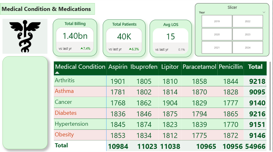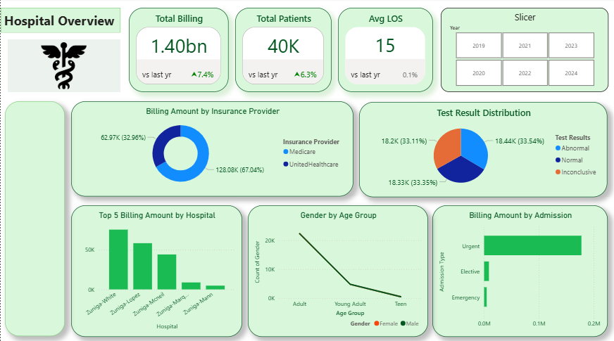 Hospital Data Analysis Report This report provides a comprehensive analysis of hospital operations, patient demographics, and medical outcomes. Using Power BI, the dashboard explores key performance metrics such as patient admissions, length of stay, billing amounts, test results, and medical conditions across multiple hospitals. The visuals enable stakeholders to identify trends in patient inflow, monitor treatment efficiency, and understand the financial performance of each hospital or department. Interactive filters allow users to drill down by year, gender, age group, admission type, and diagnosis category, helping decision-makers uncover actionable insights for improving healthcare delivery and resource allocation.