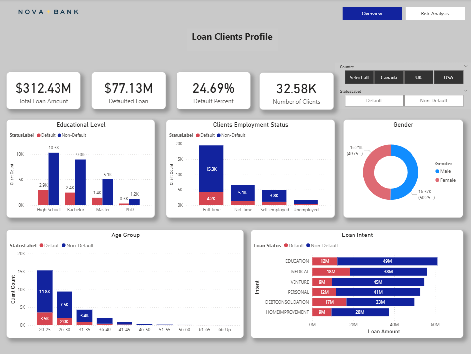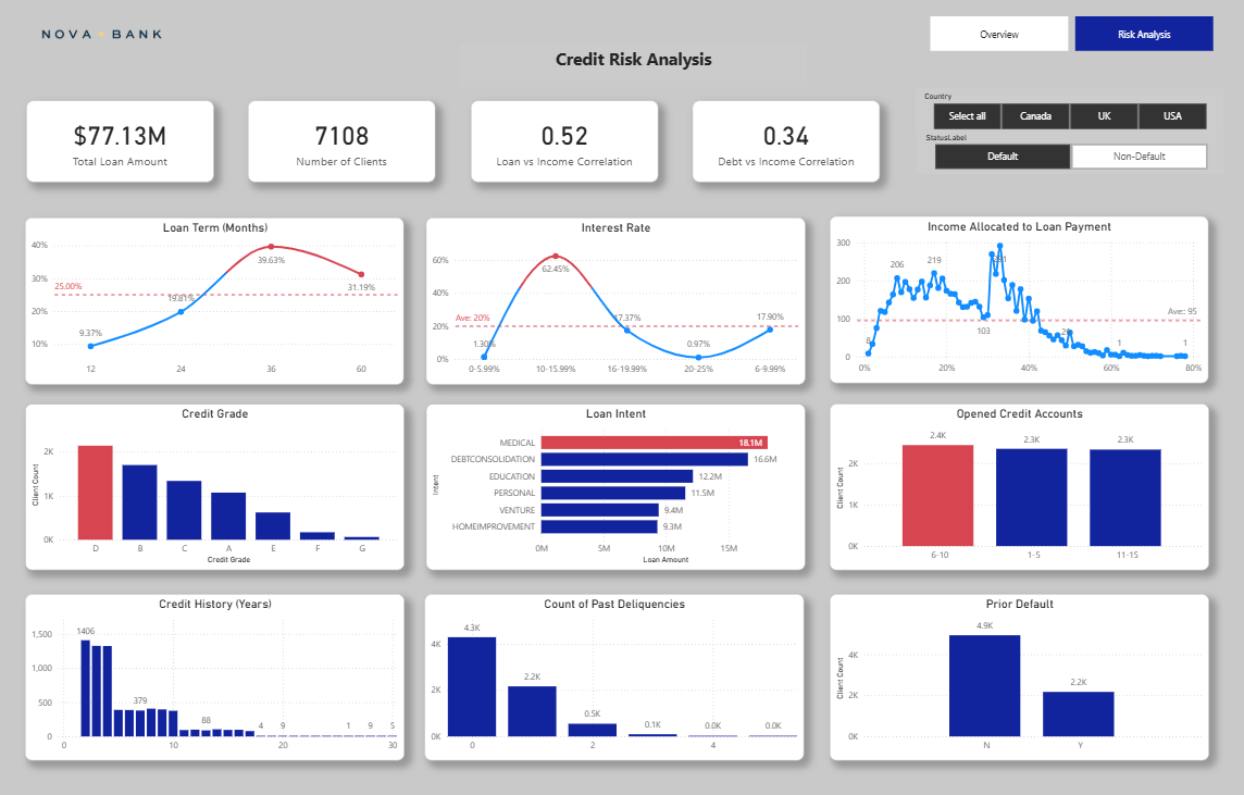 Trends identified based on default loans data: Loan Affordability: Defaults strongly linked to high loan-to-income ratios (correlation = 0.52). Borrowers allocating >30% of income to loan payments show sharp risk increases. Loan Structure: High risk of defaulting is at 6% - 16% interest rates along with the length of loan which are all risky at 36-month to 60-months. This means the longer the payment term, combined with the high interest gives real risk exposure. Borrower Profile: Credit Grade D borrowers dominate defaults. Loan Purpose: Medical and Debt Consolidation (which are mostly in Grade D) loans carry the largest default exposure. Recommended Actions: Tighten Affordability Limits → Cap loan payments at ≤30% of income. Reprice or Restrict High-Risk Segments → 36-month terms, 6–16% interest loans, and Grade D borrowers. Strengthen Underwriting → Give heavier weight to credit history. Manage Loan Intent Risk → Reduce exposure to Medical and Debt Consolidation loans. Portfolio Rebalancing → Shift approvals toward Grades A–C to stabilize default rates.