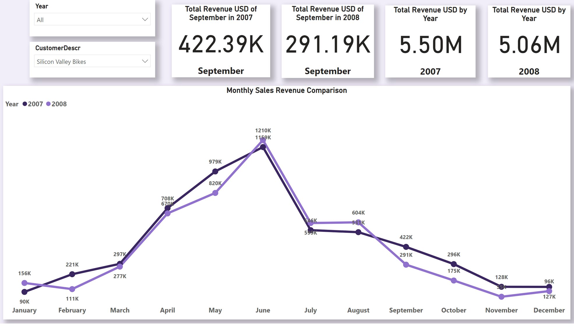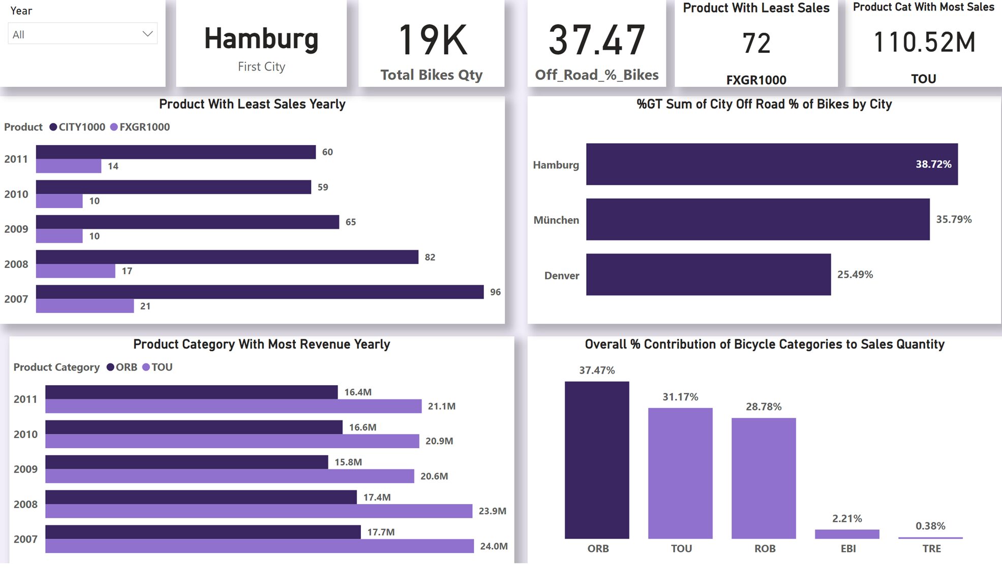 This project utilizes Power BI to analyze a multi-year global sales dataset, specifically comparing market resilience between the US and Germany. By identifying a significant revenue decline in the US and a discount-driven stability in Germany, the analysis provides a strategic roadmap for market recovery. The project highlights Off-Road and Road Bikes as primary revenue drivers with heavy Q2/Q3 seasonality, while identifying underperforming SKUs for removal. These insights allow for optimized inventory planning and targeted city-level marketing strategies, ultimately aiming to build a more resilient retail ecosystem against economic fluctuations.