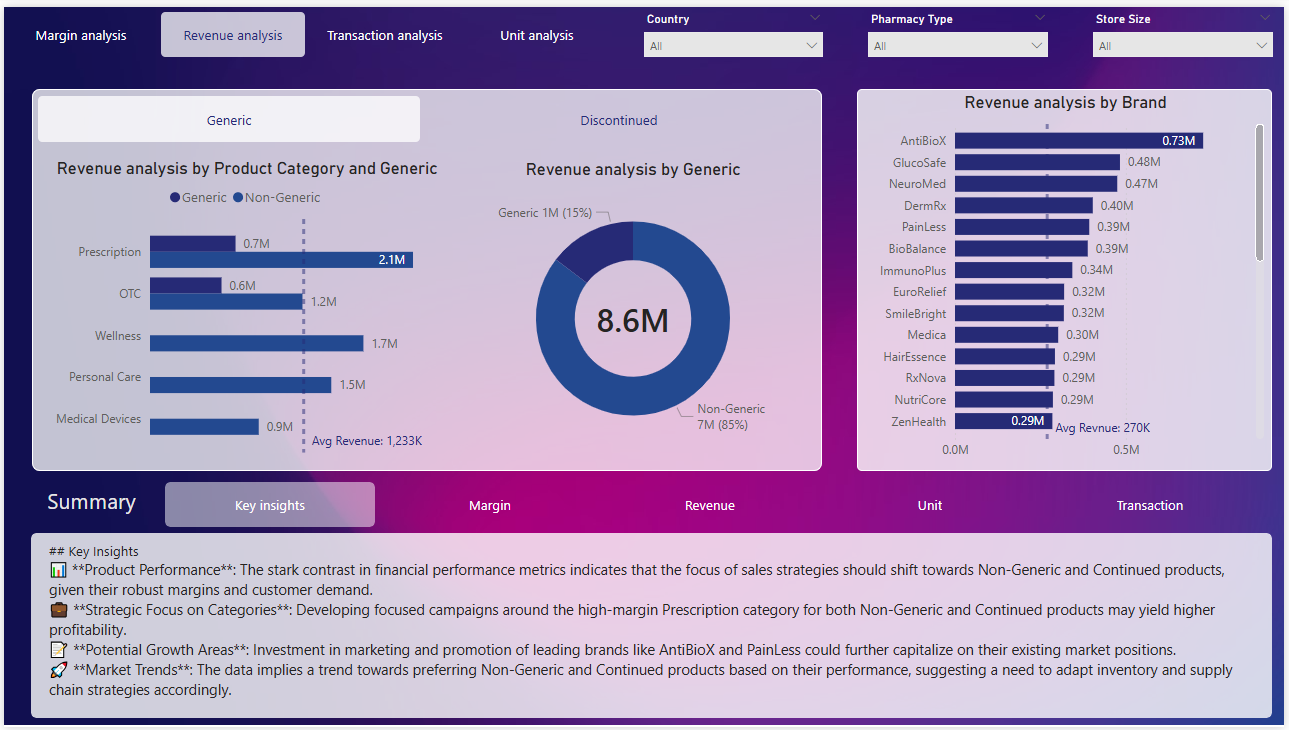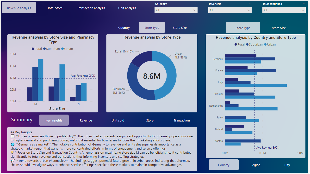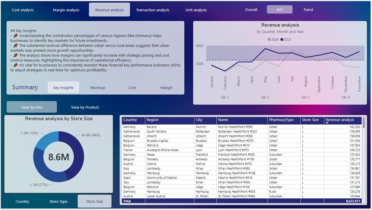 The report provides an analysis of the financial performance in terms of revenue, margin, and cost trends from January 2024 to December 2025. It highlights significant increases in these financial metrics, focusing on geographical and demographic segments such as urban, suburban, and rural areas, as well as different market categories denoted by: S, M, L. The analysis reveals the contributions of each segment to overall performance, indicating trends and patterns over the analyzed period.