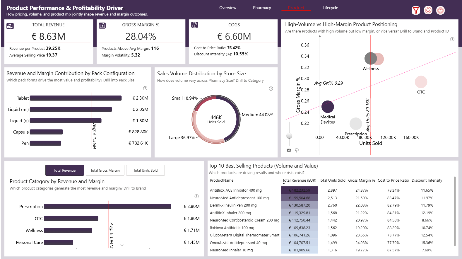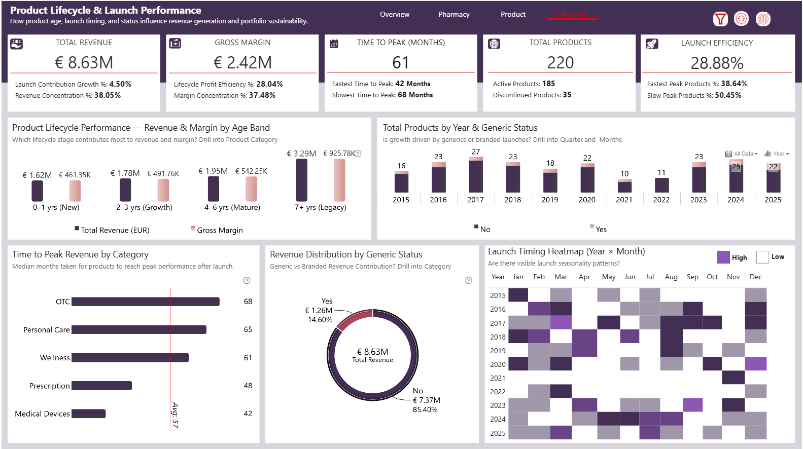 Page 1: Executive Overview: Financial Pulse of the Business This page establishes the commercial baseline. Revenue (€8.63M), Gross Margin (€2.42M), and 446K units sold are analyzed alongside growth trends and seasonality. The margin bridge clearly shows COGS as the dominant profitability lever, while promotional impact remains measured. Urban pharmacies lead performance, and 89% of revenue comes from non-promoted sales, signaling strong core demand resilience. Page 2: Geographic & Pharmacy Benchmarking Performance by Location Sales distribution across European markets reveals revenue concentration in key countries, with identifiable performance gaps. Benchmarking pharmacies against regional averages isolates true outperformers versus scale-driven volume leaders, and execution efficiency metrics highlight which pharmacies convert revenue into stronger margins. The geographic view reveals expansion opportunities and underperforming pockets that require operational focus. Page 3: Product Performance & Profit Drivers : Mix & Margin Strategy Prescription and OTC dominate revenue contribution, but profitability varies significantly across categories. The high-volume vs high-margin matrix exposes positioning imbalances and optimization opportunities. Pack configuration analysis confirms tablets and liquids as key revenue drivers. Pricing diagnostics cost-to-price ratio and discount intensity provide clarity on how commercial decisions directly influence margin outcomes. Page 4: Product Lifecycle & Launch Intelligence: Portfolio Sustainability Legacy products currently generate the largest revenue share, while growth-stage products signal future upside. With a median time-to-peak of 61 months, commercialization cycles are deliberate rather than rapid. Launch efficiency metrics show over one-third of products peak quickly, yet half demonstrate slow ramp-up, highlighting refinement opportunities in launch execution and portfolio renewal strategy.
