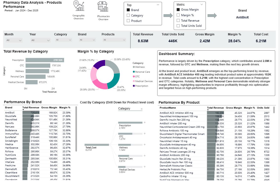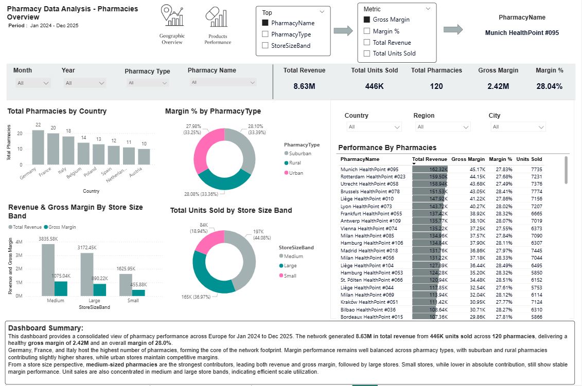 A European pharmacy chain distributor operates across multiple countries, regions, and cities, offering a wide range of pharmaceutical products through a network of pharmacies. While the organization captures detailed daily sales and cost data at the pharmacy and product level, decision-makers currently lack a consolidated, interactive view of business performance. The leadership team needs a data-driven analytical solution to understand how sales, profitability, and margins vary across geographies, pharmacy formats, and product segments. They also want to identify top- and under-performing pharmacies, regions, and product categories to support pricing decisions, inventory planning, and regional expansion strategies. The report should enable stakeholders to: Compare sales, gross margin, and profitability across countries, regions, and individual pharmacies Analyze product performance by category, brand, and SKU across different geographic markets Evaluate regional contributions to overall revenue and profit Identify performance patterns, outliers, and growth opportunities using interactive filters and drill-downs