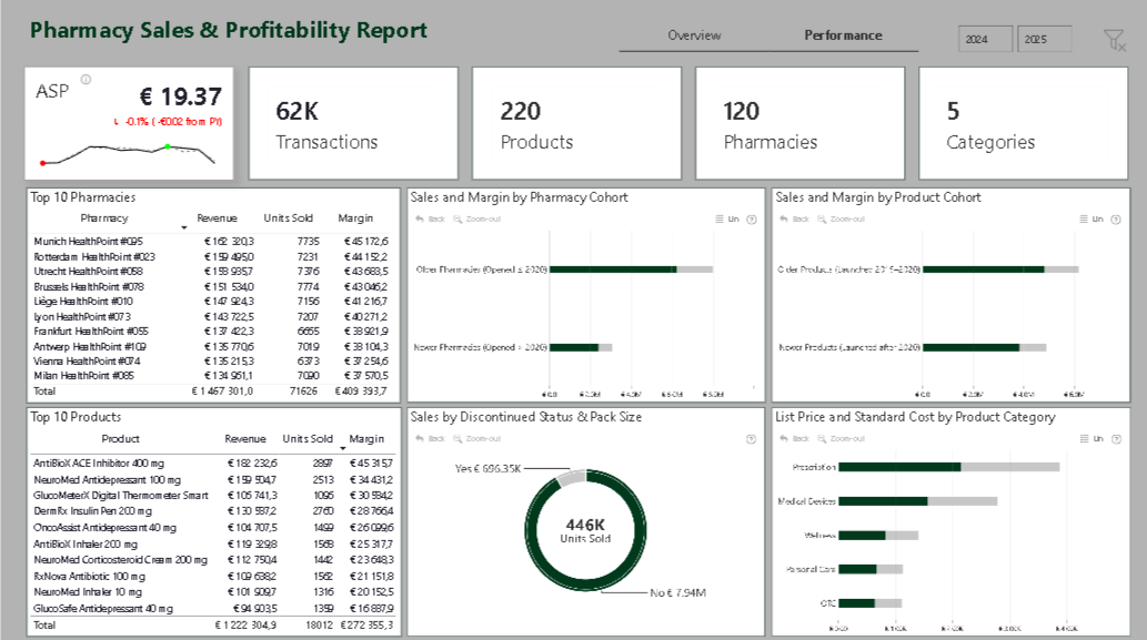 Report analyzes sales and profitability across a European pharmacy chain, highlighting performance by country, region, pharmacy type, and product category. It explores time trends, promotional impacts, and portfolio mix to identify drivers of revenue and margin. The insights provide stakeholders with a clear view of where growth is strongest and where profitability can be improved.