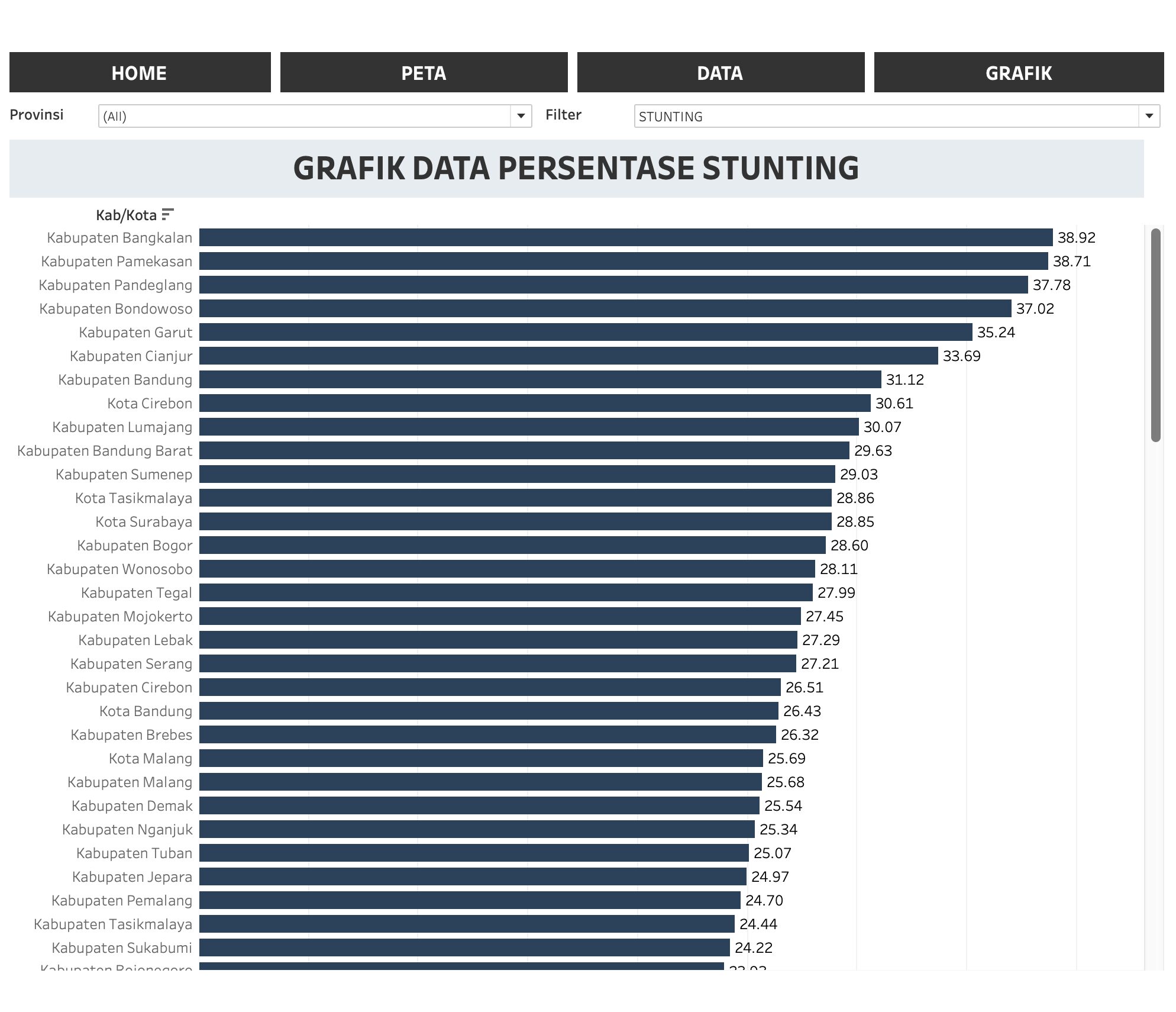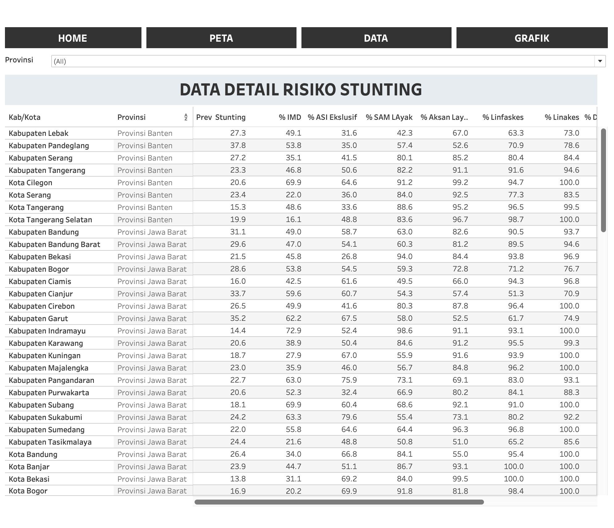 This dashboard provides a comprehensive spatial analysis of stunting rates at the regency level. By integrating various determinants—such as access to clean water, maternal nutrition, and healthcare availability—the tool allows stakeholders to identify high-risk clusters and allocate resources more effectively